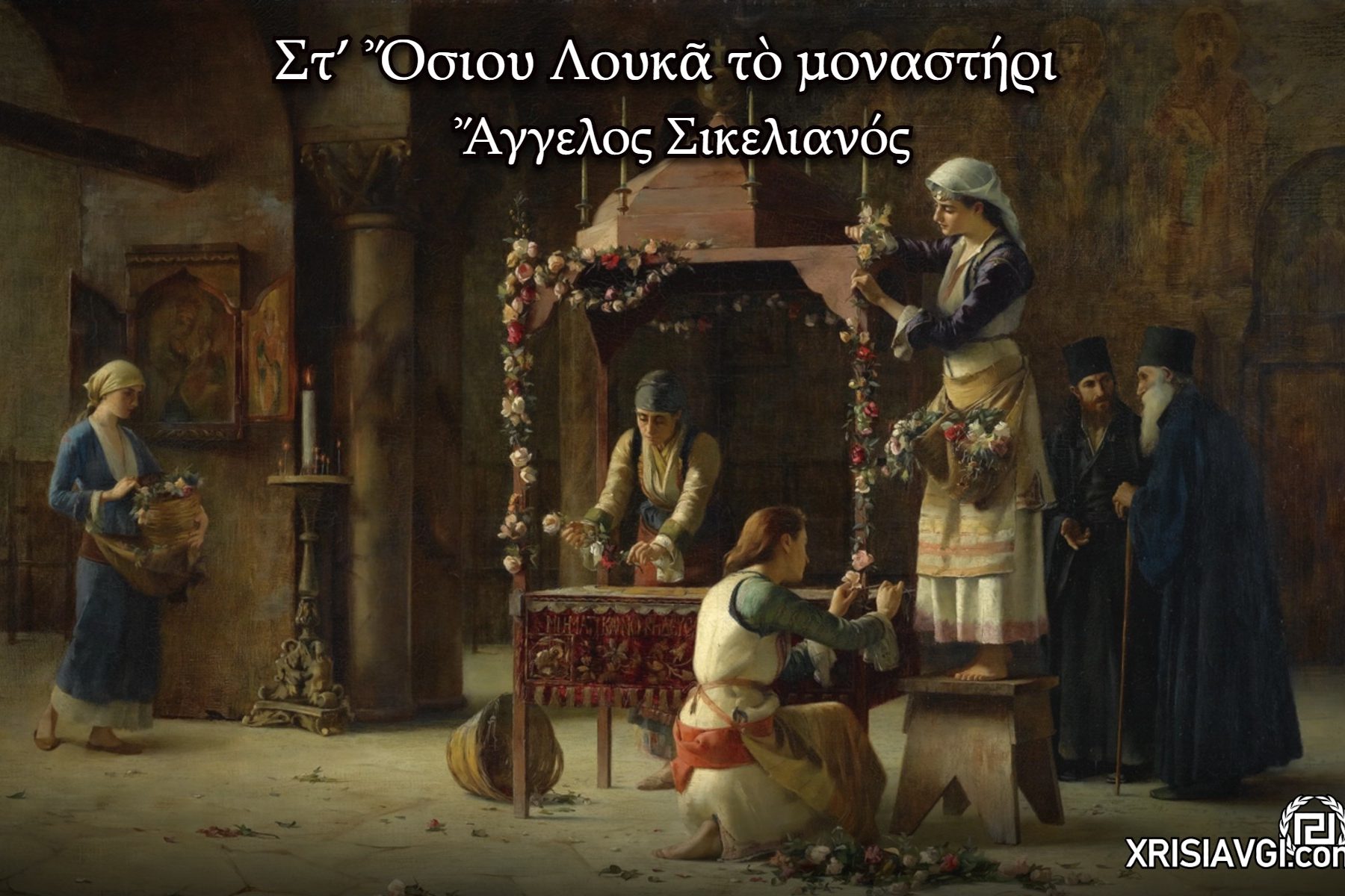 Στ’ Όσιου Λουκά το μοναστήρι Στ’ Όσιου Λουκά το µοναστήρι, απ’ όσες γυναίκες τού Στειριού συµµαζευτήκαν τον Επιτάφιο να στολίσουν, κι όσες, µοιρολογήτρες, ως µε τού Μεγάλου Σαββάτου το ξηµέρωµα αγρυπνήσαν, ποιά να στοχάστη -έτσι γλυκά θρηνούσαν! – πως, κάτου απ’ τούς ανθούς, τ’ ολόαχνο σµάλτο του πεθαµένου του Άδωνη ήταν σάρκα πού πόνεσε βαθιά;…