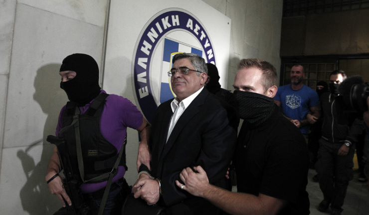 epa03887733 Leader of ultra-right wing Golden Dawn party Nikos Michaloliakos (C) is escorted by masked police officers to the prosecutor from Athens Police headquarters in Athens, Greece, 28 September 2013. Police in Greece have arrested the leader of the country’s far-right Golden Dawn party, authorities said on 28 September 2013. The arrest of Nikolaos Michaloliakos and several other party officials comes as police are investigating the 17 September fatal stabbing of a left-wing activist and rapper, Pavlos Fissas. According to media reports Mihaloliakos and Ilias Kasidiaris, member of parliament and party press spokesman of Greek far-ight Chryssi Avghi (Golden Dawn), along with 34 others were arrested on charges of alleged formation of a criminal organisation. EPA/ALKIS KONSTANTINIDIS
