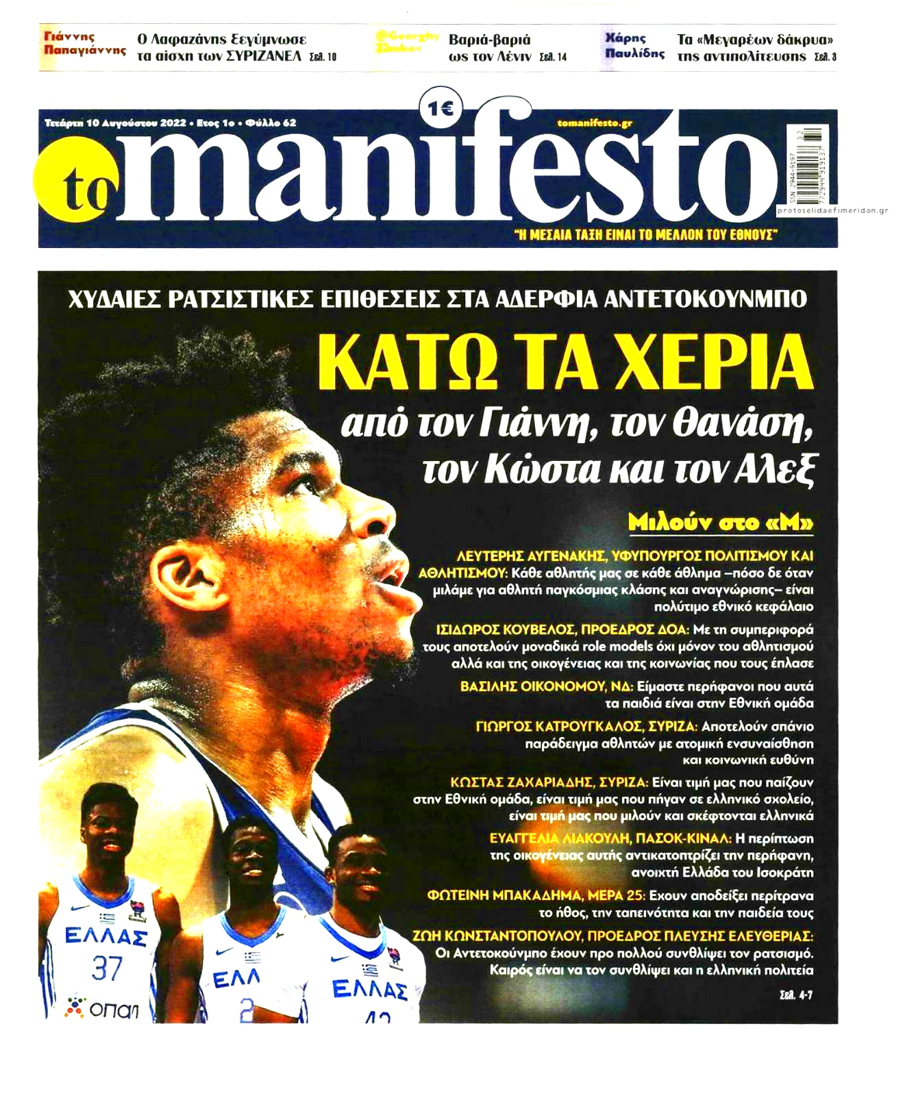 Ακόμα ένα χαρακτηριστικό παράδειγμα, το σημερινό πρωτοσέλιδο της νεοδημοκράτικης εφημερίδας “manifesto”, το οποίο φιλοξενεί επιγραμματικές δηλώσεις και από κόμματα της αριστεράς μεταξύ άλλων, κάνοντας λόγο για δήθεν “ρατσιστικές επιθέσεις” σε βάρος των “αγαπημένων” τους νιγηριανών καλαθοσφαιριστών. Ένα “παράπονο”, που αντιβαίνει στις κίβδηλες προεκλογικές υποσχέσεις περί “μαζικών απελάσεων” και “καλά φυλαγμένων συνόρων” που με τόση ευκολία ξεστόμιζαν οι δεξιοί πολιτευτάδες.