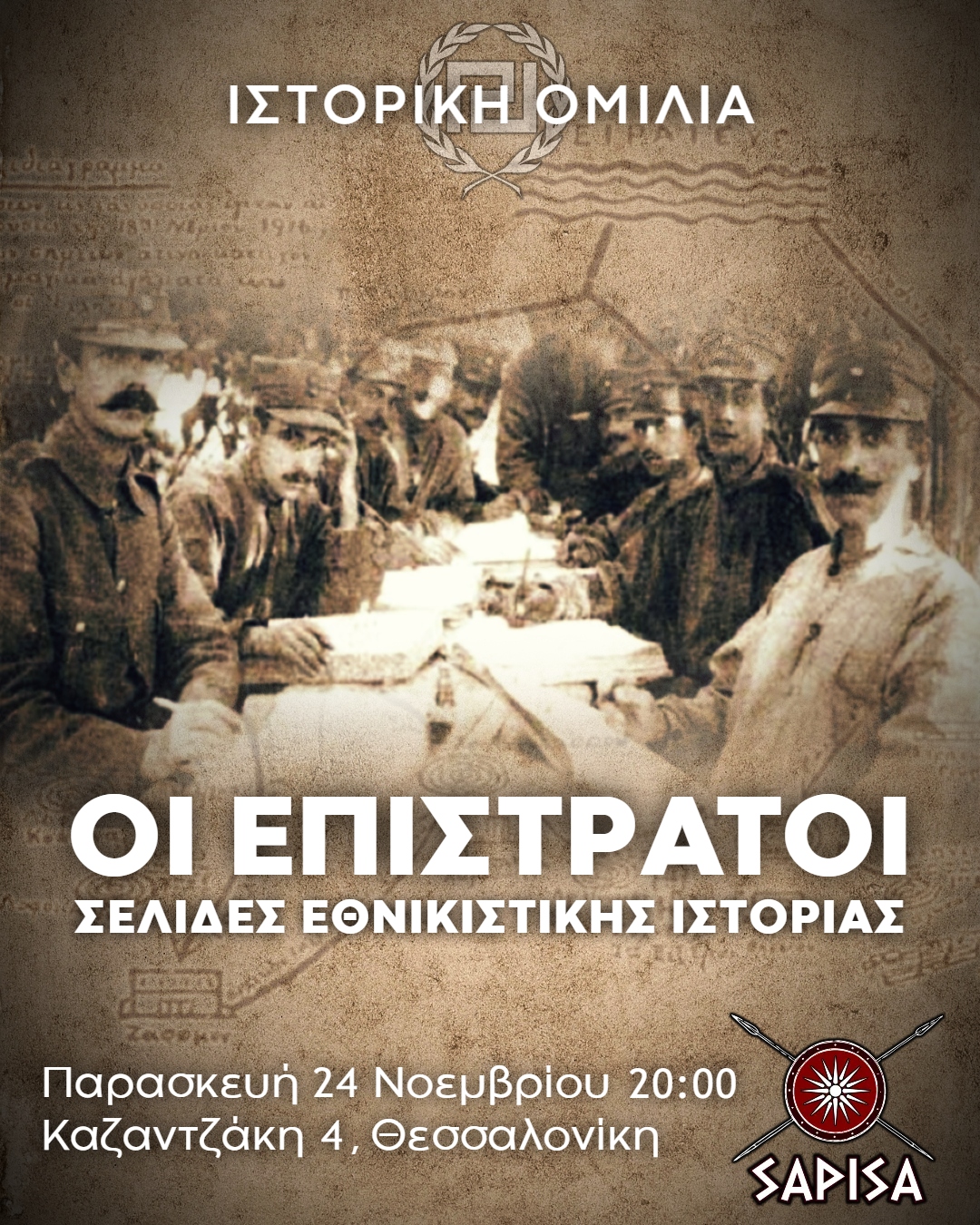 Την Παρασκευή 24 Νοεμβρίου και ώρα 20:00, θα πραγματοποιηθεί στον Εθνικιστικό πολυχώρο ΣΑΡΙΣΑ ανοιχτή ομιλία ιστορικού περιεχομένου, αφορώσα τα γεγονότα που διαδραματίστηκαν κατά τα Νοεμβριανά του 1916. Οι Επίστρατοι ως μαζική πολιτική οργάνωση έδωσαν σκληρές μάχες ενάντια στην επιβληθείσα ξενοκρατία, κι όμως μέχρι σήμερα αποτελούν στόχο κάθε είδους συκοφαντιών. Η Χρυσή Αυγή εξετάζουσα λεπτομερώς την ταραχώδη περίοδο του Εθνικού Διχασμού, φωτίζει άγνωστες πτυχές της Ελληνικής ιστορίας καταρρίπτοντας σκόπιμα επιβληθείσες στρεβλώσεις.
