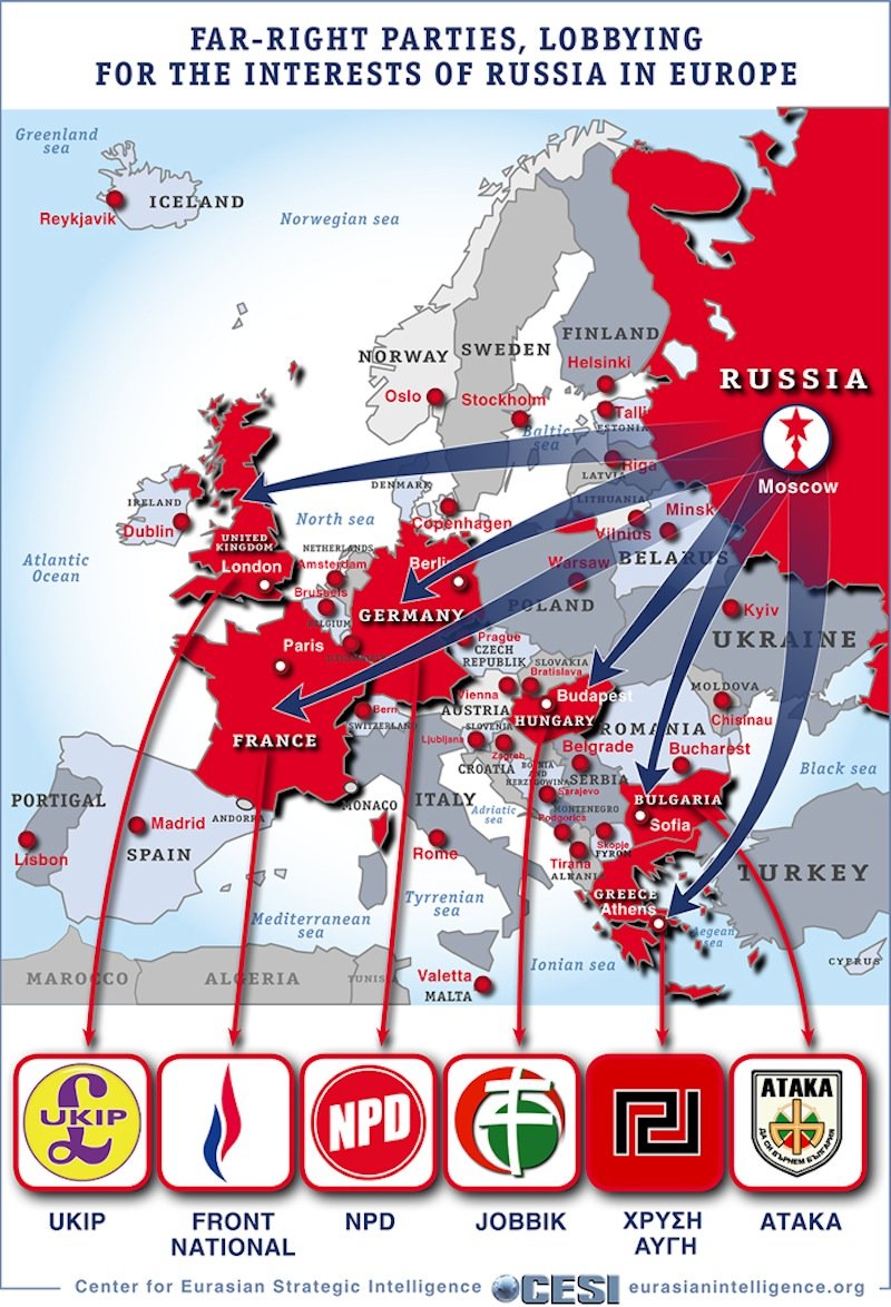 Διάγραμμα του Κέντρου Ευρασιατικής Στρατηγικής (CESI), το οποίο αποτελεί βιτρίνα της CIA, το οποίο δημοσίευσε το Business Insider, εμφανίζει τη Ρωσία ως χρηματοδότη των ακροδεξιών κομμάτων της Ευρώπης, μεταξύ των οποίων και η Χρυσή Αυγή.