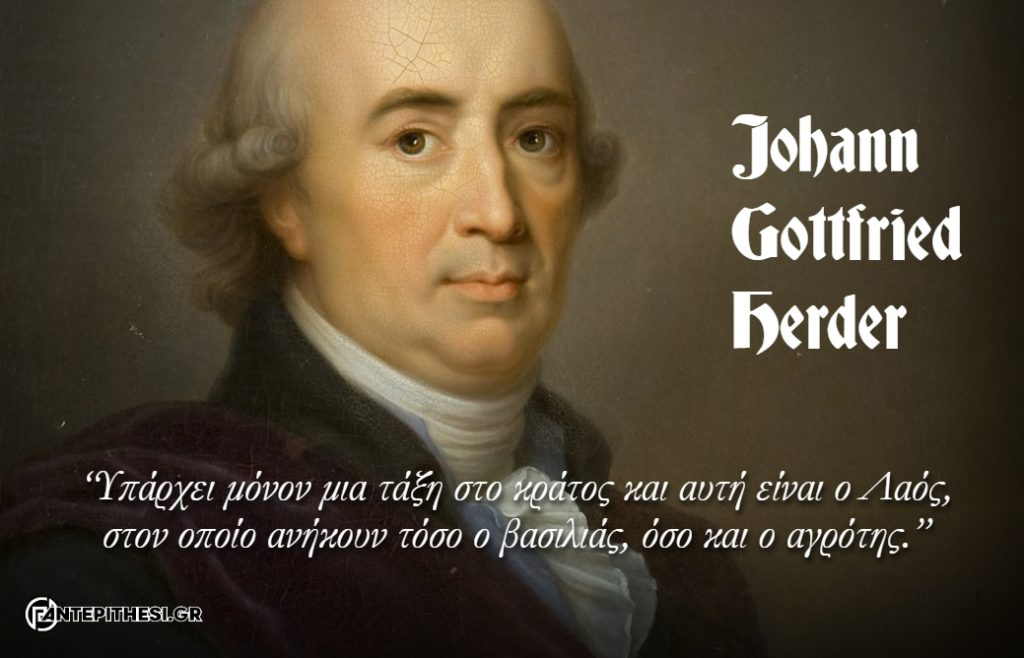 Ο Johann Gottfried Herder (1744–1803) υπήρξε διαπρεπής θεολόγος, ποιητής, κριτικός λογοτεχνίας, αλλά και ένας από τους μεγαλύτερους Γερμανούς φιλοσόφους που ανέδειξε το ρεύμα του Αντιδιαφωτισμού. Βασικός εκπρόσωπος του πνευματικού κινήματος του Ρομαντισμού, εξέλαβε την φυσική Ιεραρχία εντός ενός ομογενούς συνόλου ως μια απόλυτα εναρμονισμένη με το κοινοτικό πεπρωμένο συνθήκη, καθώς διακήρυσσε ότι «(…) υπάρχει μόνο μια τάξη στο κράτος και αυτή είναι ο λαός, στον οποίον ανήκουν τόσο ο βασιλιάς, όσο και ο αγρότης».