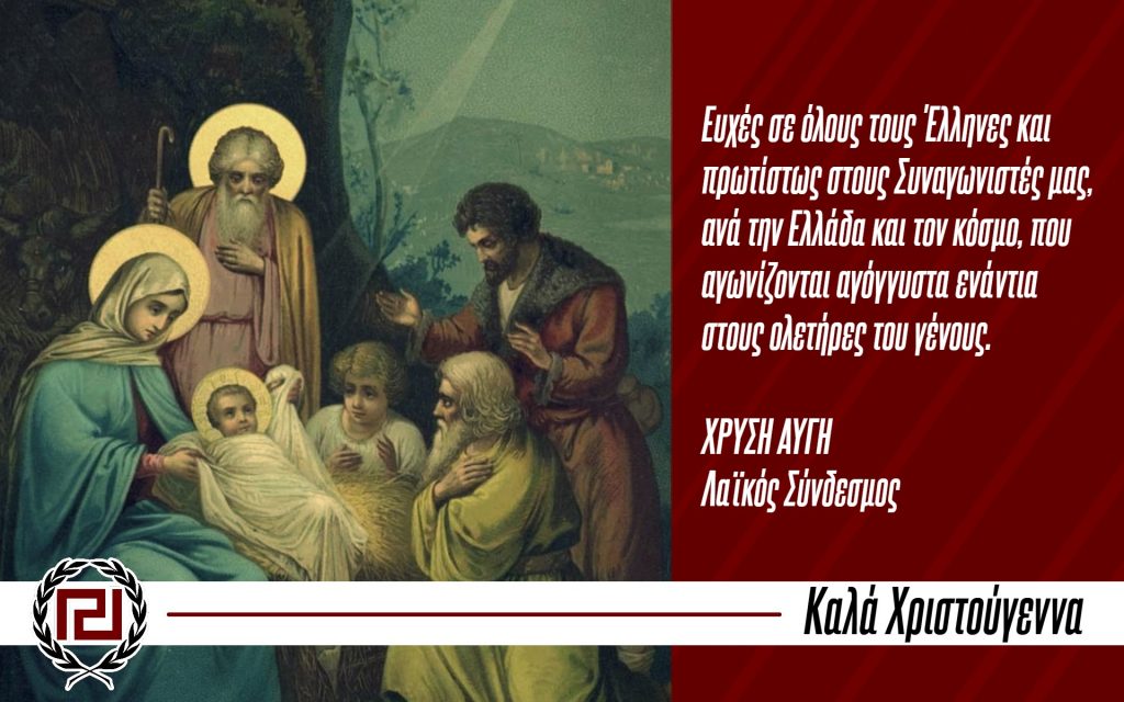 Η Χρυσή Αυγή εύχεται καλά Χριστούγεννα σε όλους τους Έλληνες και πρωτίστως στους Συναγωνιστές μας, ανά την Ελλάδα και τον κόσμο, που αγωνίζονται αγόγγυστα ενάντια στους ολετήρες του γένους. Το Φως της ενσάρκωσης του αιώνιου Λόγου ας φέρει ελπίδα στις ψυχές και των υπολοίπων συμπατριωτών μας, ώστε να σταθούν δίπλα μας στην προσπάθεια του Κινήματος για την αναγέννηση του Ελληνισμού.