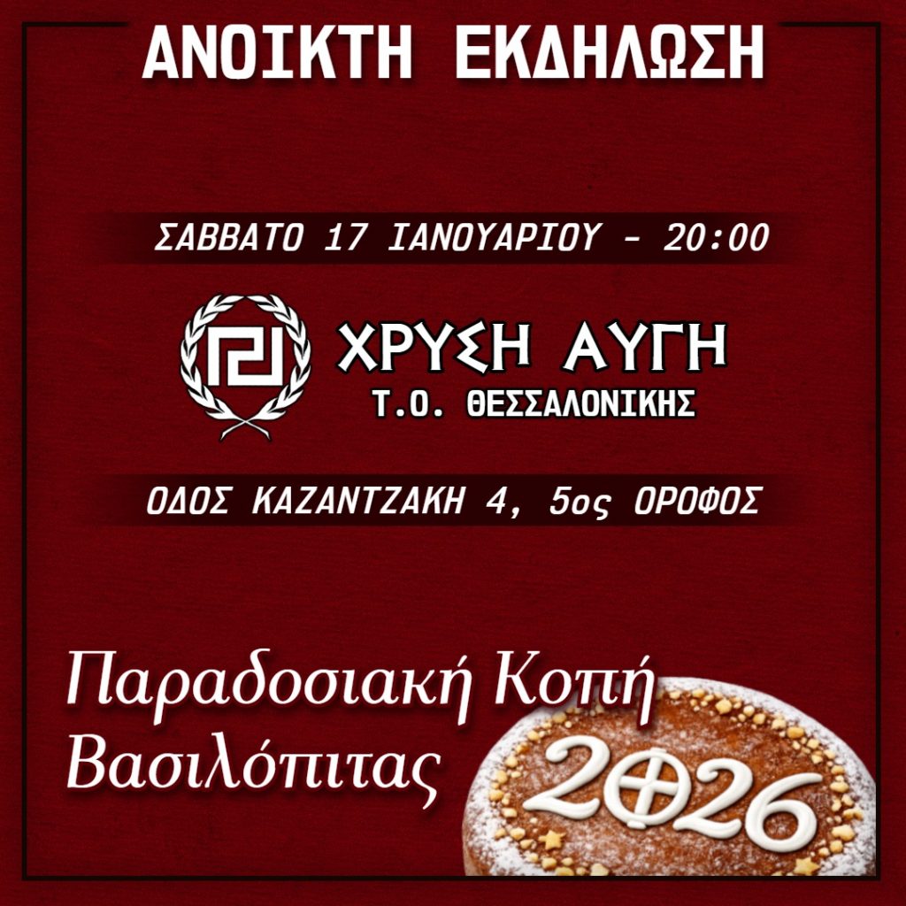 Η Τοπική Οργάνωση Θεσσαλονίκης της Χρυσής Αυγής, τηρώντας την Ελληνική παράδοση, προσκαλεί όλους τους φίλους του Κινήματος σε ανοιχτή προς το κοινό εκδήλωση για την κοπή της παραδοσιακής βασιλόπιτας. Παράλληλα, θα πραγματοποιηθούν σημαντικές ανακοινώσεις σχετικά με τις επερχόμενες δραστηριότητες στην ευρύτερη Μακεδονία.
