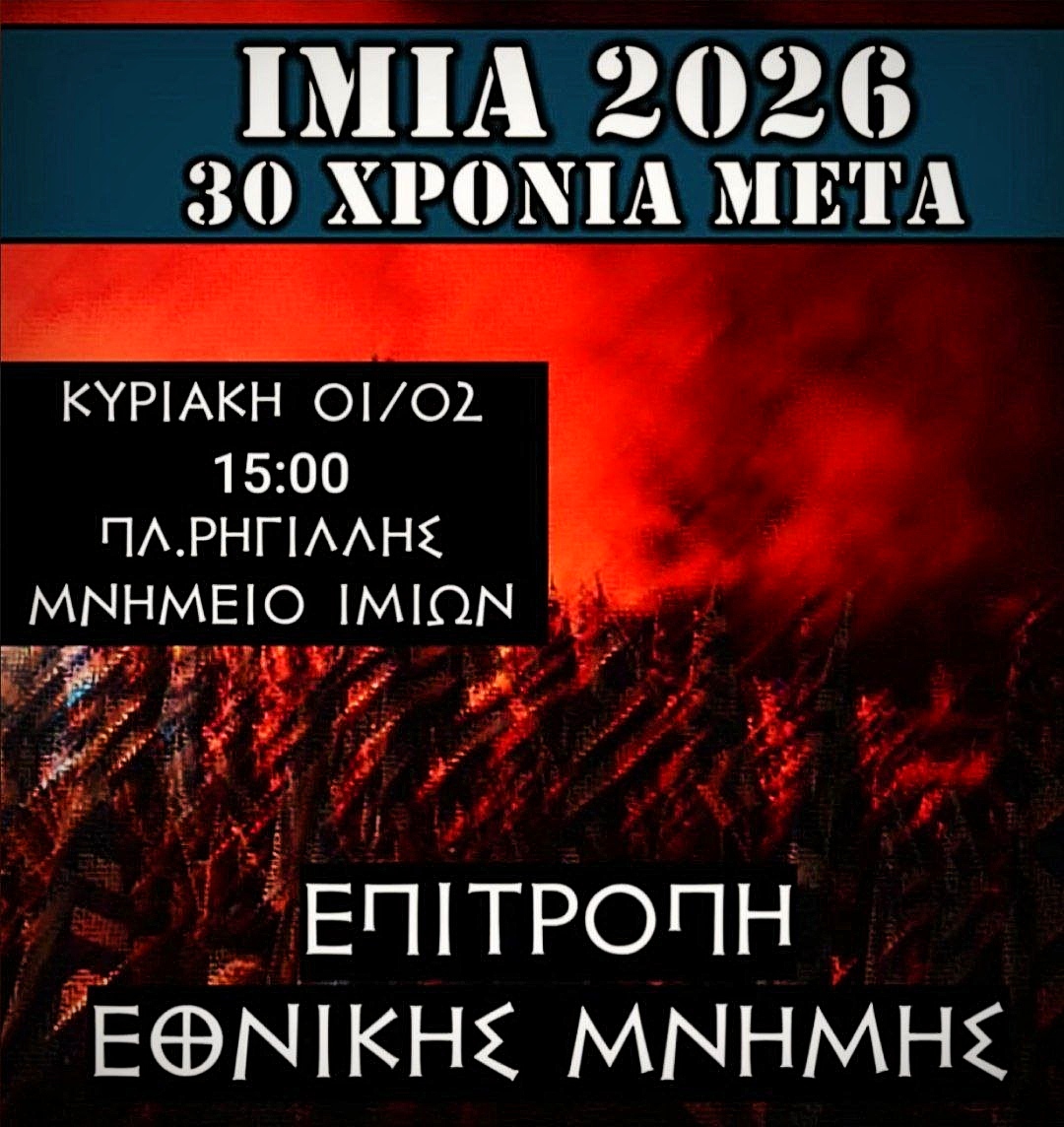 Ο Λαϊκός Σύνδεσμος – Χρυσή Αυγή καλεί όλους τους Έλληνες Εθνικιστές να δώσουν το «παρών» στην εκδήλωση Τιμής και Μνήμης για τους πεσόντες Ήρωες των Ιμίων, η οποία διοργανώνεται από την Επιτροπή Εθνικής Μνήμης, την 1η Φεβρουαρίου και ώρα 15:00 στο μνημείο Ιμίων, επί της πλατείας Ρηγίλλης.