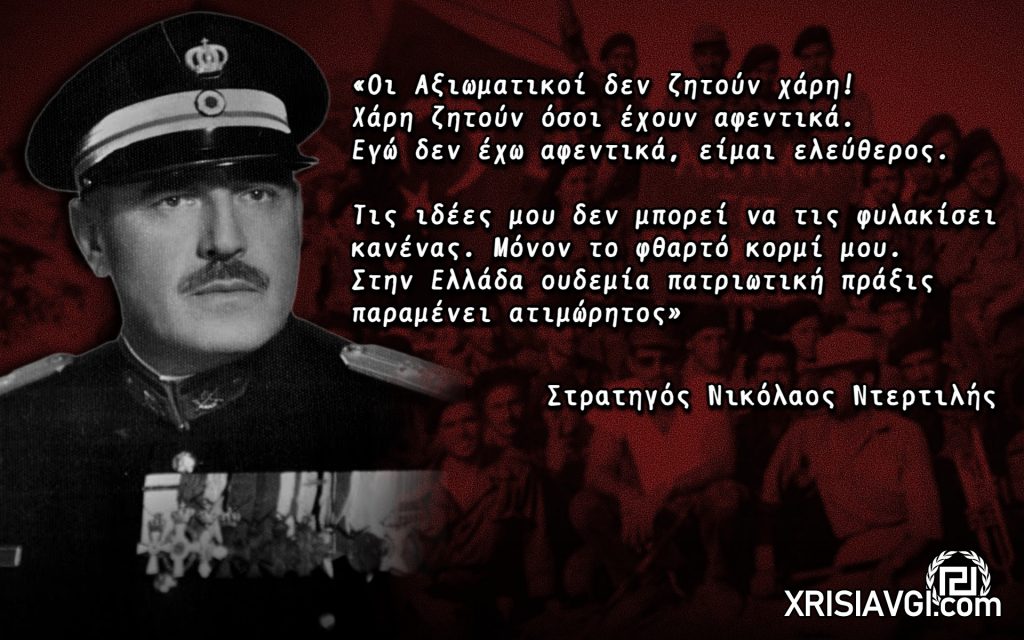 Αυτός είναι ο Ήρωας Νικόλαος Ντερτιλής, τον οποίο το μεταπολιτευτικό ανθελληνικό καθεστώς επιχείρησε να καταβάλει διά της εκδικητικής τιμωρίας. Βράχος Ήθους και Τιμής, πάνω στον οποίο τσακίστηκαν με πάταγο οι μύχιες επιδιώξεις του Καθεστώτος των κοινοβουλευτικών προδοτών. Ο Στρατηγός, ασθενής και γέροντας ακόμη, στάθηκε πραγματικός Τιτάνας του Ελληνικού Εθνικισμού και της αληθούς Στρατιωτικής Τιμής, αυτής της Τιμής την οποία ντροπιάζουν οι σημερινοί ένστολοι παρατρεχάμενοι υπουργών και βουλευτών, αρνούμενος μετά πρωτόγνωρου πάθους να νομιμοποιήσει το καθεστώς της μεταπολίτευσης! Έφυγε απροσκύνητος, με ψηλά το κεφάλι. Άφησε την τελευταία του πνοή, πιστός στο λόγο της στρατιωτικής του Τιμής, ένας ξεχωριστός Έλληνας, ένας Στρατιώτης, που είχε χύσει το αίμα του για την Πατρίδα, στο πεδίο της μάχης και που τα στήθη του κοσμούσαν παράσημα ανδρείας!