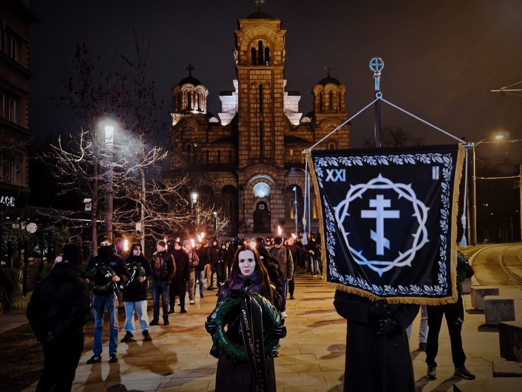 Η ημέρα της τελετής έφτασε και εκατοντάδες εθνικιστές συγκεντρώνονται στην εκκλησία του Αγίου Μάρκου, εκεί όλοι θα ανάψουν ένα κερί στη μνήμη του πεσόντα. Μια μακρά παράταξη σχηματίζεται με το λάβαρο της εκδήλωσης και τα στεφάνια των συμμετεχόντων στην κορυφή. Οι δάδες ανάβουν, η επιβλητική πορεία ξεκινάει και διασχίζει σιωπηλά τις λεωφόρους του Βελιγραδίου. Ο δρόμος φτάνει στο σημείο όπου ο νεαρός Σέρβος έπεσε νεκρός 18 χρόνια πριν. Εκεί εναποθέτονται στέφανα και κόκκινα άνθη. Λίγες στιγμές μετά η εκδήλωση λήγει με το προσκλητήριο νεκρών «Ζόραν Βούγιοβιτς – Παρών!».
