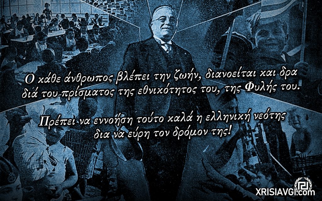 «Ο κάθε άνθρωπος βλέπει την ζωήν, διανοείται και δρα διά του πρίσματος της εθνικότητος του, της φυλής του. Η Φυλετικότης είναι φυσιολογικόν φαινόμενον. Πρέπει να εννοήση τούτο καλά η ελληνική νεότης δια να εύρη τον δρόμον της».