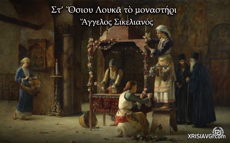 Στ’ Όσιου Λουκά το μοναστήρι Στ’ Όσιου Λουκά το µοναστήρι, απ’ όσες γυναίκες τού Στειριού συµµαζευτήκαν τον Επιτάφιο να στολίσουν, κι όσες, µοιρολογήτρες, ως µε τού Μεγάλου Σαββάτου το ξηµέρωµα αγρυπνήσαν, ποιά να στοχάστη -έτσι γλυκά θρηνούσαν! – πως, κάτου απ’ τούς ανθούς, τ’ ολόαχνο σµάλτο του πεθαµένου του Άδωνη ήταν σάρκα πού πόνεσε βαθιά;…